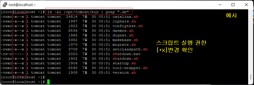 [root@localhost ~]# ls -al /opt/tomcat/bin | grep ".sh" (변경 확인)