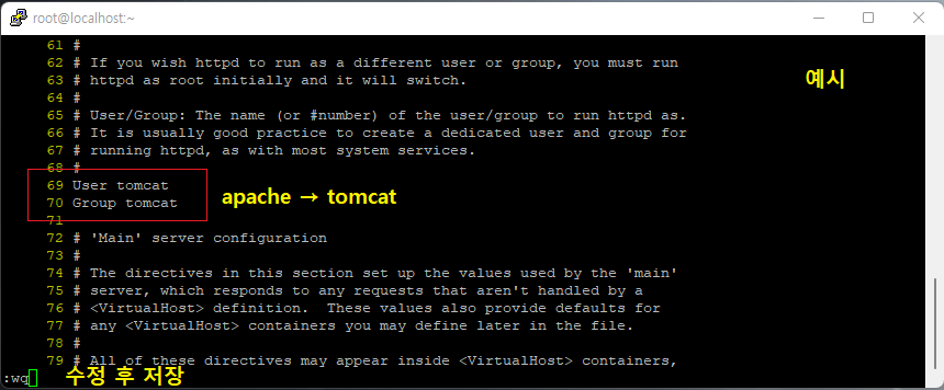 [root@localhost ~]# vi /etc/httpd/conf/httpd.conf (유저, 그룹 권한 변경)