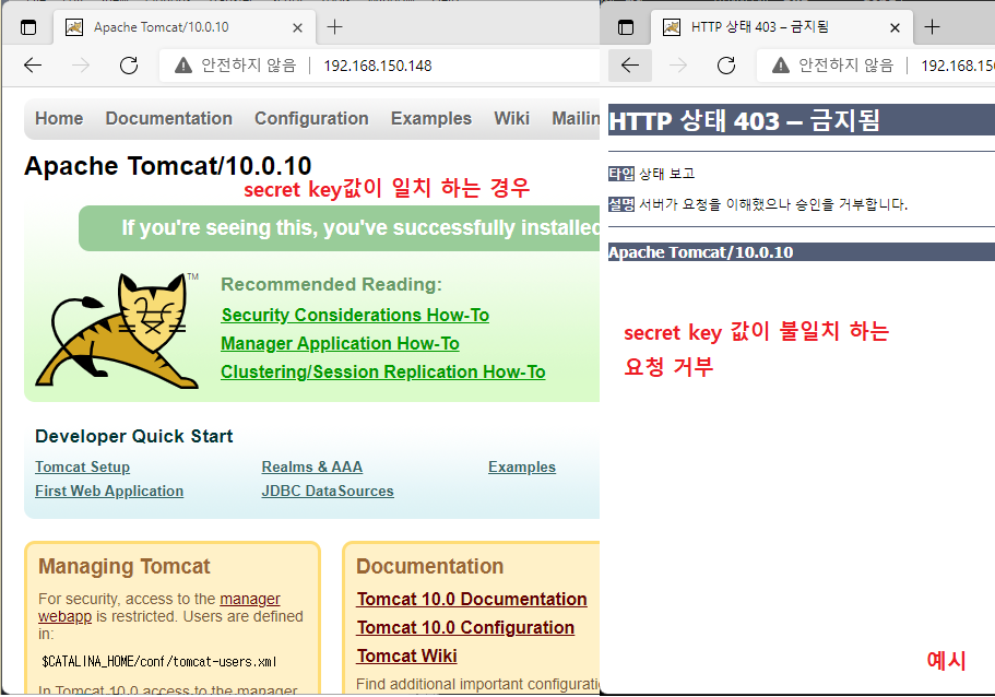 secret - 기본값이 NULL 상태로 secretRequired가 명시적으로 구성되지 않는 한 값으로 지정되어야 처리가 됩니다. 값으로 구성된 경우는 세팅 시 Apache와 Tomcat 같은 보안 키가 일치해야 하며 그렇지 않으면 secretRequired 설정에 관계없이 요청이 거부가 됩니다.
