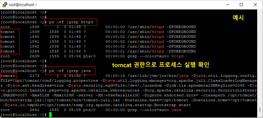 [root@localhost ~]# ps -ef |grep java (톰캣 프로세스 구동 확인)