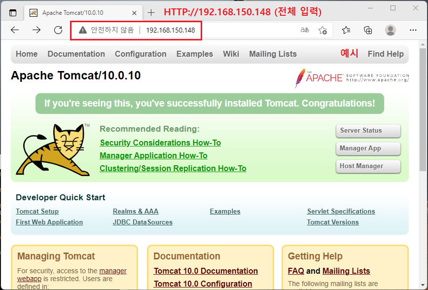 본인 PC 브라우저 URL 입력 http://서버IP