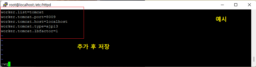 [root@localhost ~]# vi /etc/httpd/conf/workers.properties (worker 설정)
