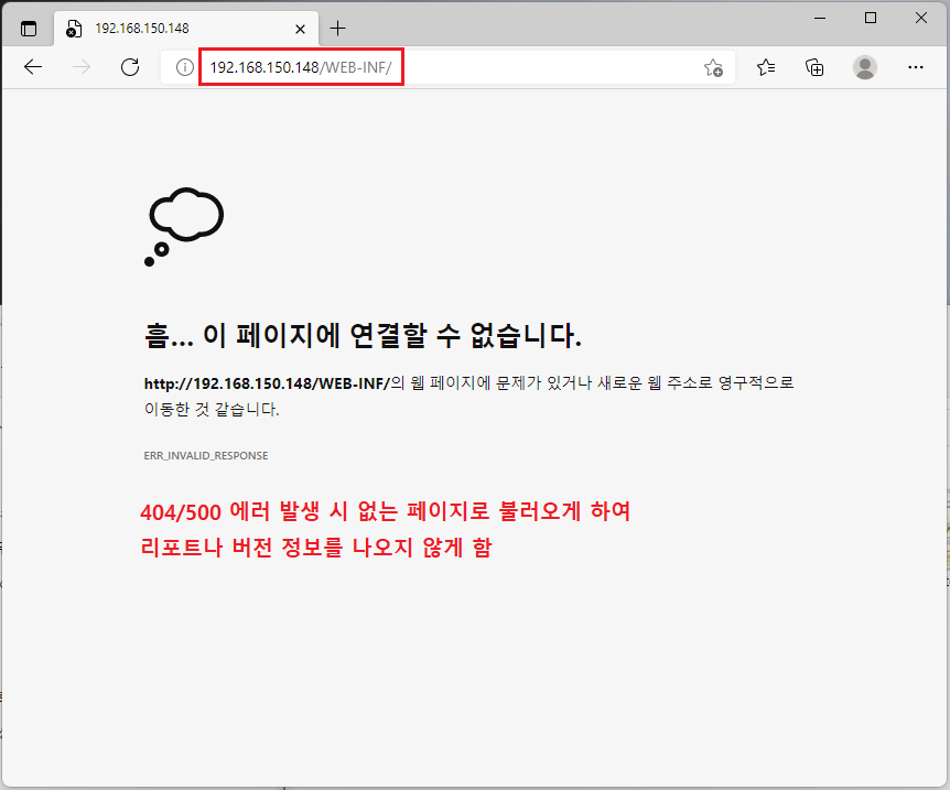 error-page - 사용자가 직접 만든 에러 페이지를 연결할 때 쓰는 지시문입니다. 여기서는 일부러 없는 경로의 페이지로 연결하여 보고서나 버전 정보를 노출되지 않도록 하는 방법입니다. location의 임의 이름. html으로 설정하면 됩니다.
