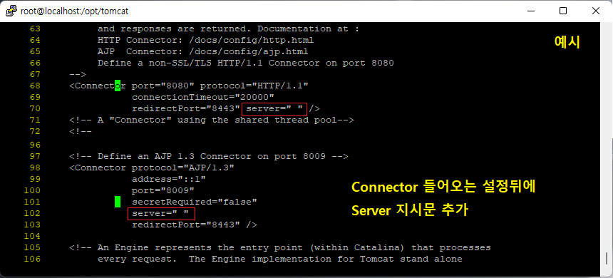 [root@localhost ~]# vi /opt/tomcat/conf/server.xml (톰캣 설치 경로의 Server.xml 파일 수정)