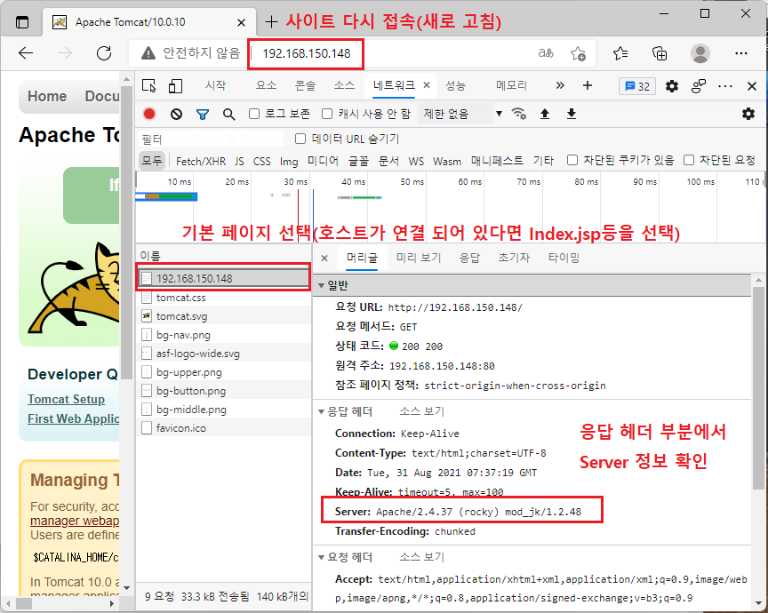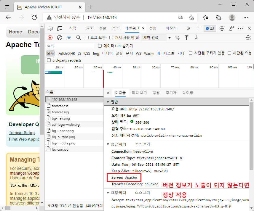 ③ 개발자 도구 상태에서 사이트 재 접속(새로 고침), 이름 부분에서 처음으로 불러오는 기본 페이지 이름을 선택하면 됩니다.(일반적으로 호스트로 연결되어 있다면 Index.jsp 등을 선택합니다.) 머리글을 클릭하면 정보를 불러오며 그중 응답 헤더의 Server 정보를 확인하면 됩니다. 버전 정보가 나온다면 보안 취약점에 감지될 수 있습니다.