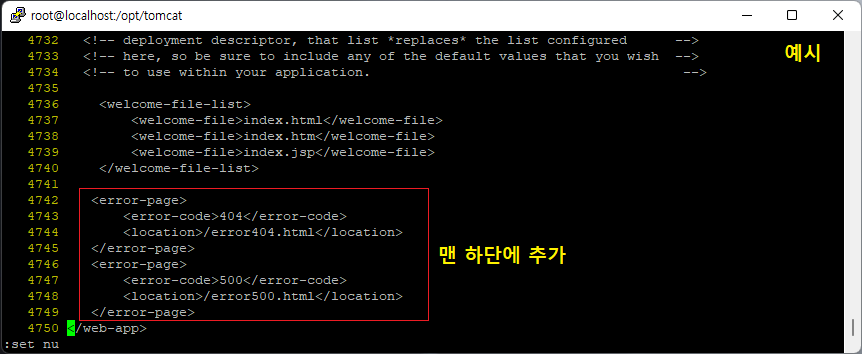 [root@localhost ~]# vi /opt/tomcat/conf/web.xml (톰캣 설치 경로의 web.xml 파일 수정)