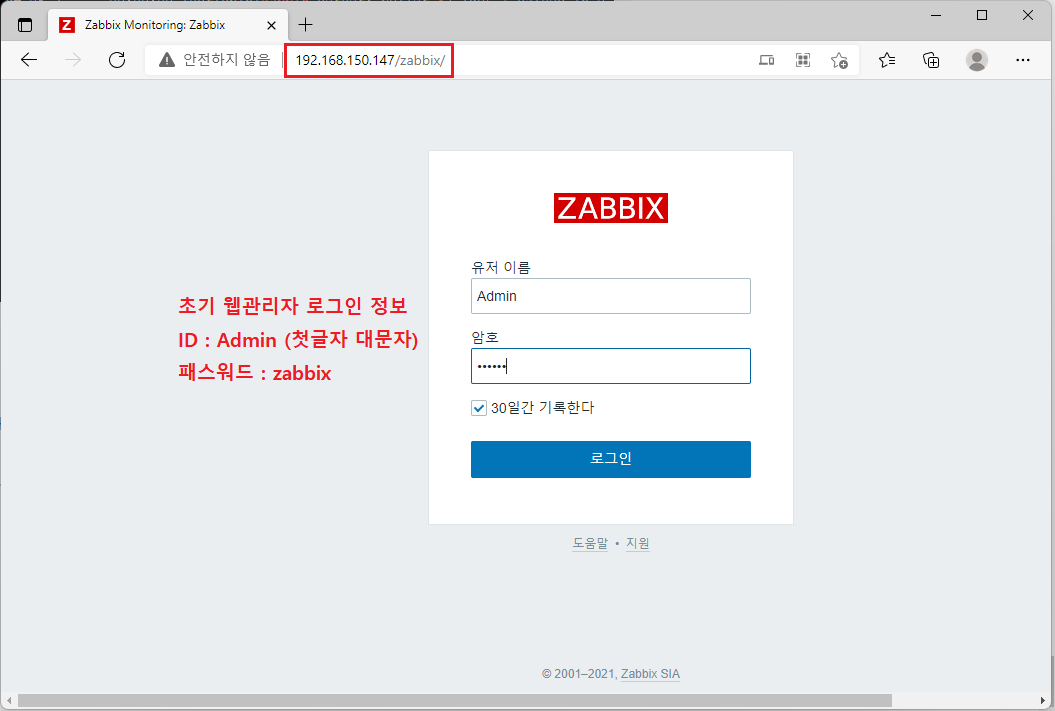 설치 후 처음 웹 관리자 로그인 페이지 접속 정보는 [ ID : Admin / PASS : zabbix ]입니다. [대소문자 주의]