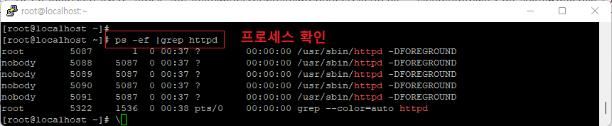□ 5-3 아파치 시작 및 프로세스 구동 확인[service httpd start(stop) 명령어 사용 가능]