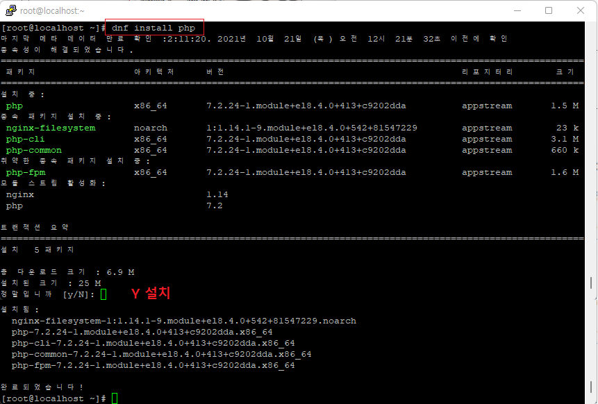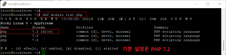 [root@localhost ~]# dnf module enable php:7.2 [7.2로 활성화]