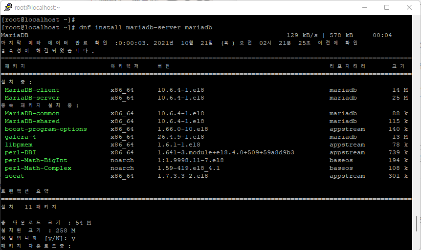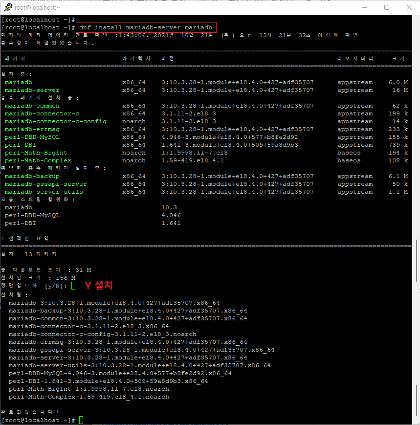 [root@localhost ~]# dnf remove mariadb-server mariadb [10.6.X 제거]