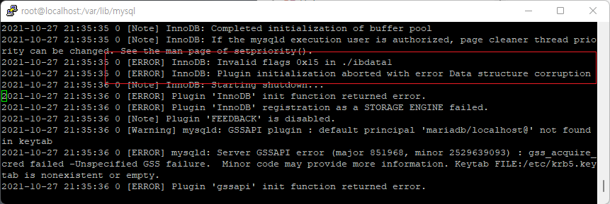 2021-10-27 21:35:35 0 [ERROR] InnoDB: Plugin initialization aborted with error Data structure corruption