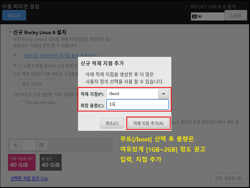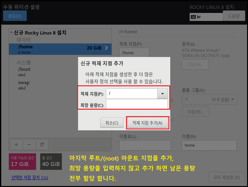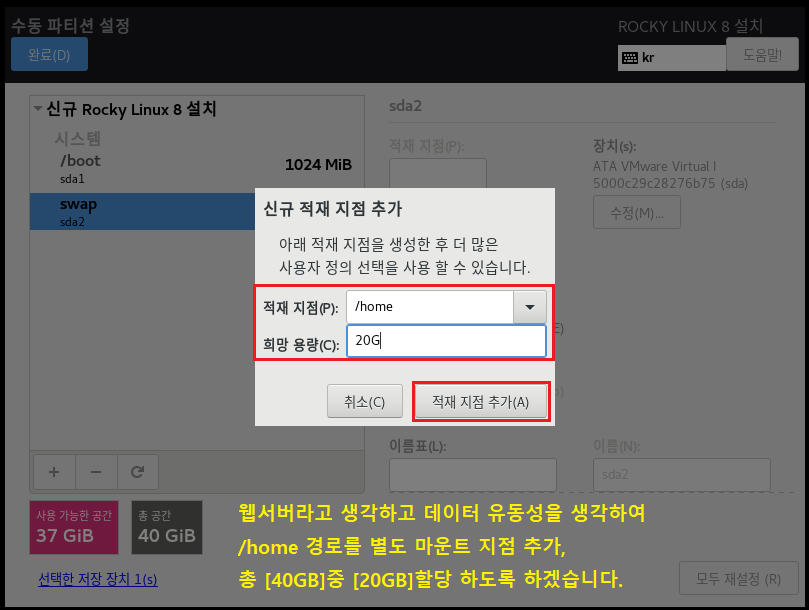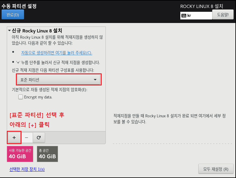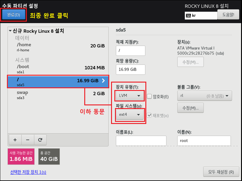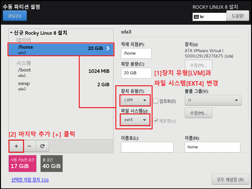 ◇ 파일 시스템[EXT4] , 장치 유형[LVM]으로 설정하는 이유는 속도나 효율적으로 디스크를 사용 및 관리하기 위해서 입니다. 이제 가상화 솔루션에서도 많이 안정화되었으며 여러모로 특징이 많으므로 기본적으로 사용하는 게 좋습니다. 수동으로 설정하는 이유도, 개발 및 시스템 관리자가 될 경우 OS를 설치할 때 소프트웨어를 편하게 관리하기 위해 파티션 별로 용량을 나누고 볼륨 그룹, 레이블, 이름 등으로 구분할 수 있게 하는 연습을 하는 게 좋습니다.