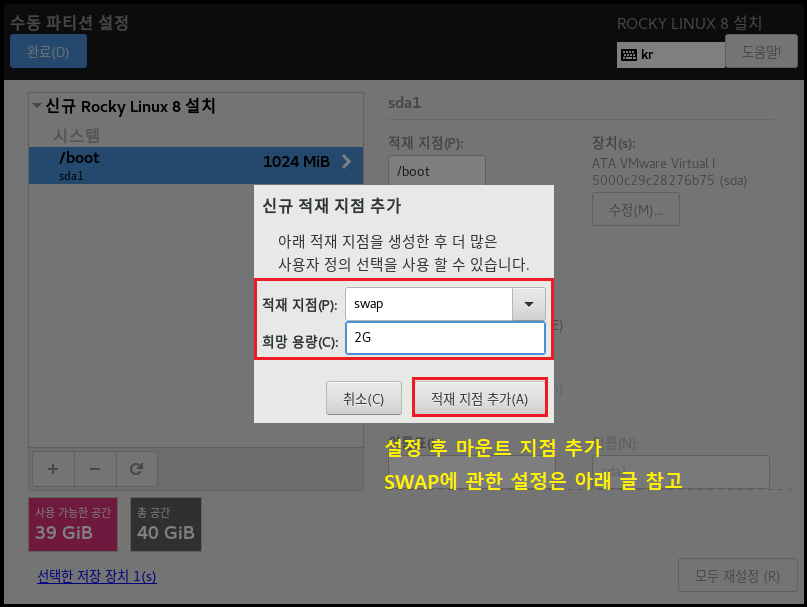 ◇ SWAP은 일종의 메모리 확보라고 생각하시면 될듯합니다. 하드디스크의 일부를 마치 메모리처럼 사용할 수 있게 해주는 기술입니다. RAM 메모리가 부족할 때 대신 SWAP 파티션을 잡아두었던 메모리를 사용합니다. 일반적으로 RAM 사용량의 2배 이상 권고 설정이라고 알고 있는 분들도 있으시겠지만 서버의 용도나 실서버 하드웨어에 들어가는 RAM 용량이 얼마냐에 따라 튜닝 작업을 해야 합니다. 하지만 저희는 테스트이며 기본적으로 1~2GB RAM으로 세팅하므로 위 동일하게 하시고 넘어가면 됩니다. 하드디스크의 용량을 사용하기 때문에 충분히 용량을 확인하고 설정하시기 바랍니다.