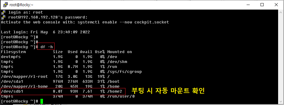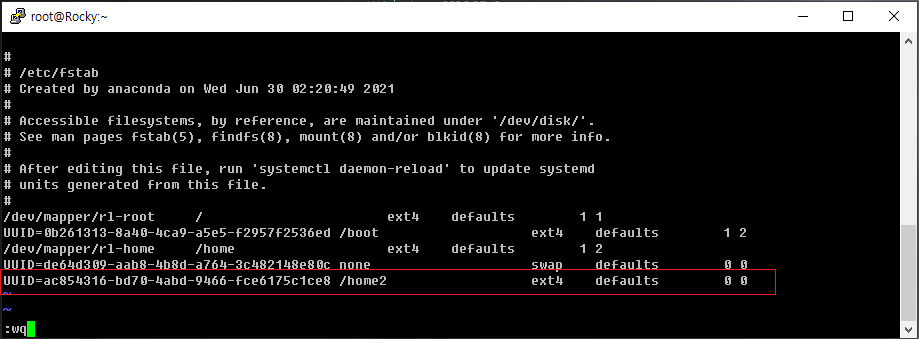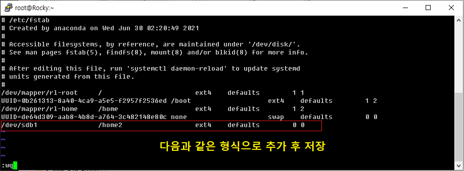 [root@Rocky ~]# vi /etc/fstab [맨 하단에 추가 후 저장]