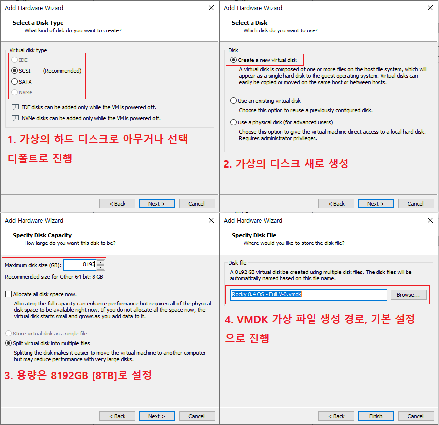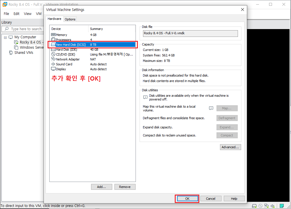 ※ VMware는 가상 디스크 씬 프로비저닝 기능을 지원하기 때문에 내 PC에 실제 8TB의 공간을 잡고 있는 게 아니라 가상의 형태로 공간을 표시하는 부분입니다. 간단하게 얘기하면 용량 표시만 8TB 일뿐이며, 실제로는 작업에 필요한 스토리지 공간만큼만 사용합니다.