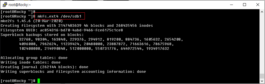 [root@Rocky ~]# mkfs.ext4 /dev/sdb1