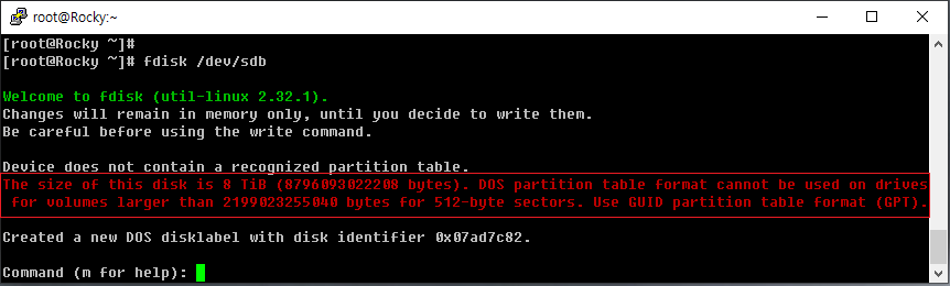 The size of this disk is 8 TiB (8796093022208 bytes). DOS partition table format cannot be used on drives for volumes larger than 2199023255040 bytes for 512-byte sectors. Use GUID partition table format (GPT).