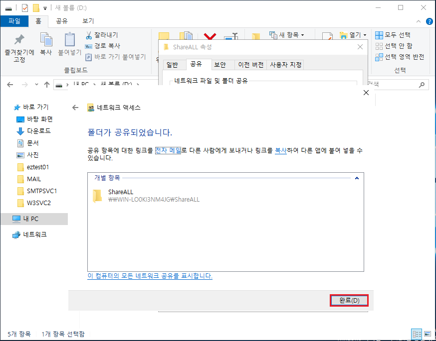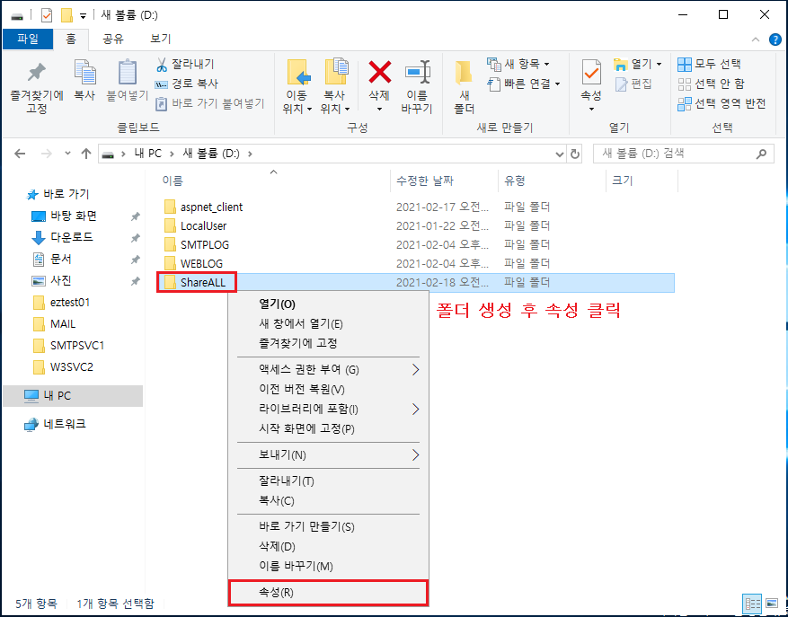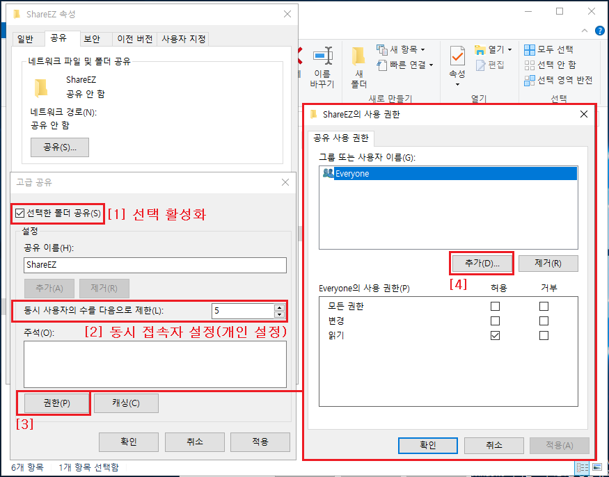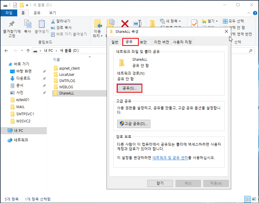 4-1 동일한 방법으로 ShareEZ 폴더 생성 ▷ 속성 ▶ 고급 공유(D) 클릭