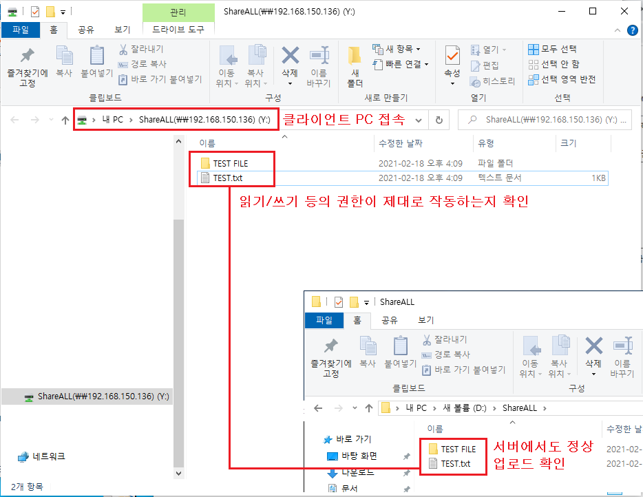 3-3 클라이언트 PC 정상 접속 확인 및 읽기/쓰기 등의 권한이 제대로 작동하는지 확인