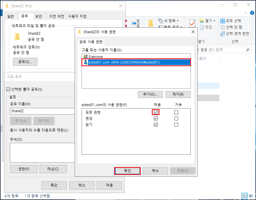 ◇ 권한 : 모든 사용자가 접속 후 읽기는 가능하되 특정 사용자(관리자)만 읽기 쓰기가 가능하도록 하려면 [Everyone] 디폴트 설정은 삭제하지 말고 [eztest01] 사용자를 추가하여 모든 권한을 주면 됩니다. [eztest01] 사용자만 공유폴더에 접속하고 싶다면 [Everyone]을 제거하면 됩니다.