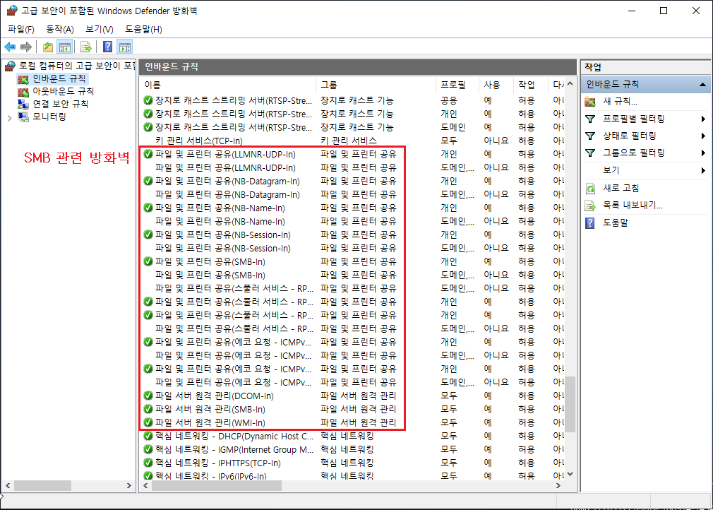 네트워크를 통해 파일 및 프린터 공유를 하다 보니 공격을 많이 당하게 되므로 취약점도 많이 발생합니다. 사용할 경우는 대체로 같은 사설 내부 네트워크를 사용하는 폐쇠망에서 사용하는 것을 권고하며 이용하지 않는다면 고급 방화벽 자체에서도 규칙 사용 안 함을 하는 게 좋습니다.