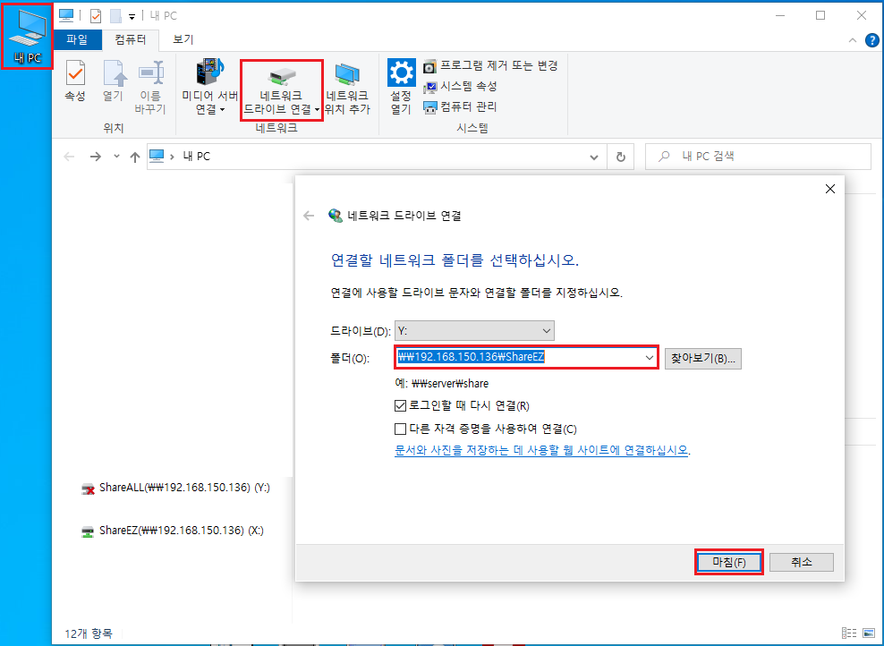 내 PC 에서 네트워크 드라이브 연결 폴더 부분에 공유한 폴더 이름을 입력합니다.
